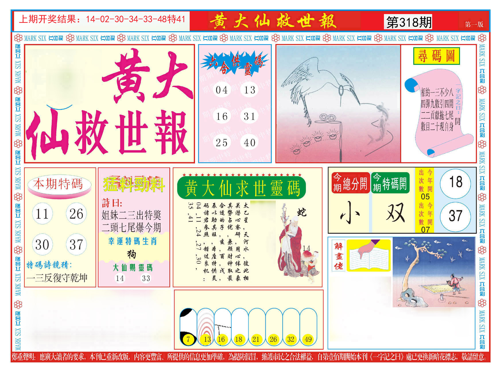 香港新新彩 318期⑥肖 | 【鸡蛇牛猴猪马】 | 兔15错 |