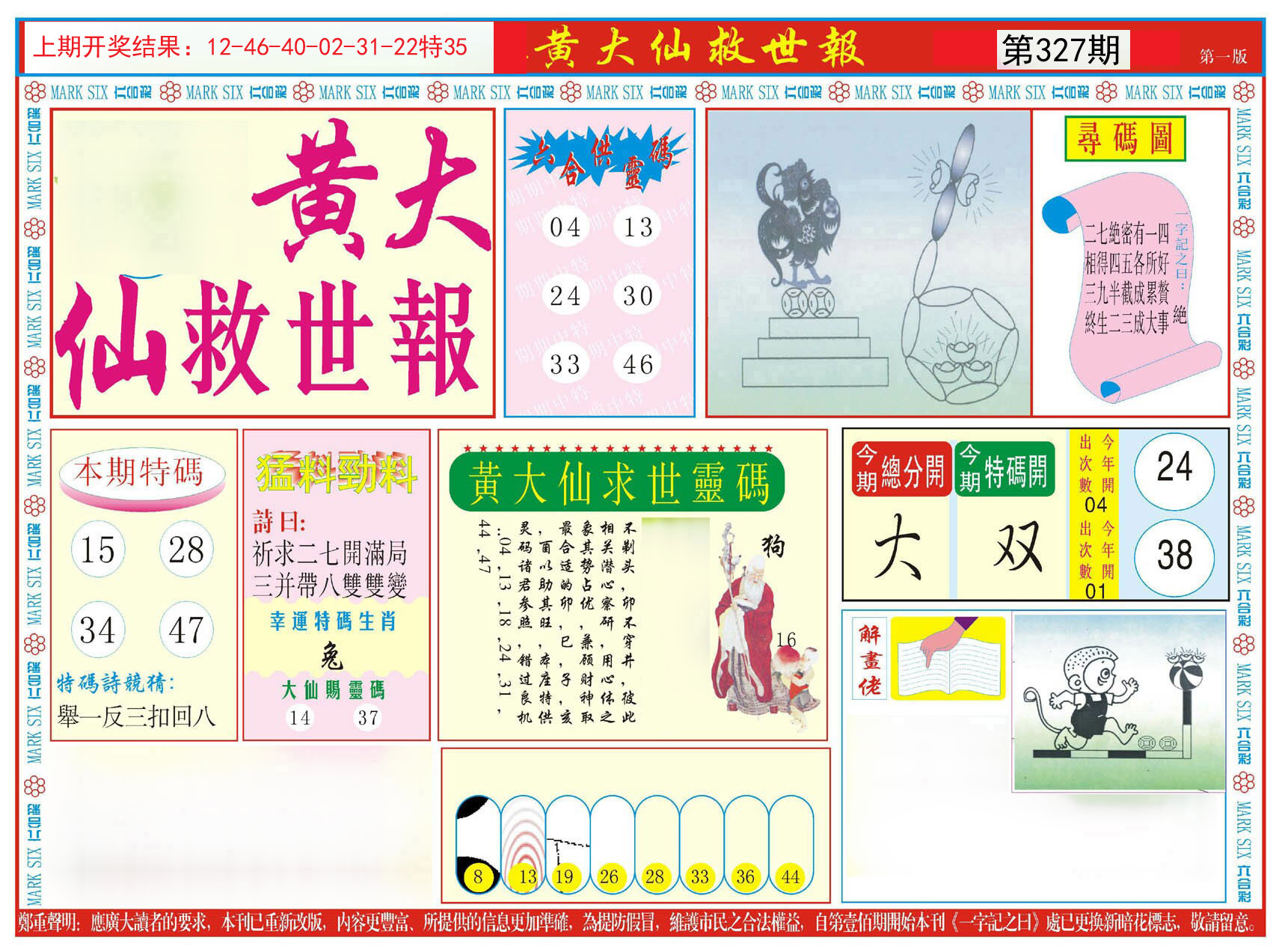 香港新新彩 327期⑥肖 | 【狗蛇牛龙鸡猴】 | 龙14对 |